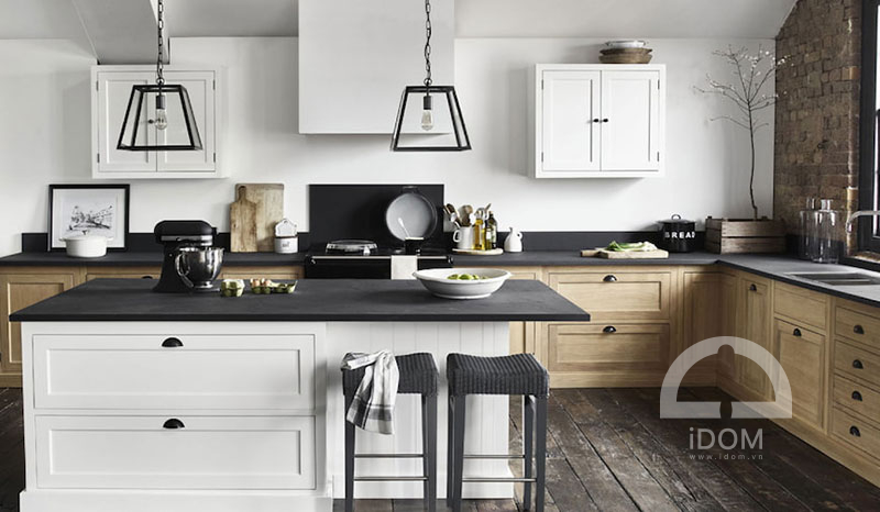 Vì bếp khô nhỏ và dễ bảo trì nên bạn có thể kết hợp các vật liệu làm mặt bàn hợp xu hướng và đắt tiền.