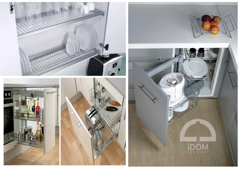 - Tiết kiệm không gian hiệu quả: Các phụ kiện tủ bếp thông minh như giá xoay, ray trượt, kệ nâng hạ giúp tận dụng tối đa diện tích bên trong tủ, đặc biệt là những góc khuất hoặc tủ cao.