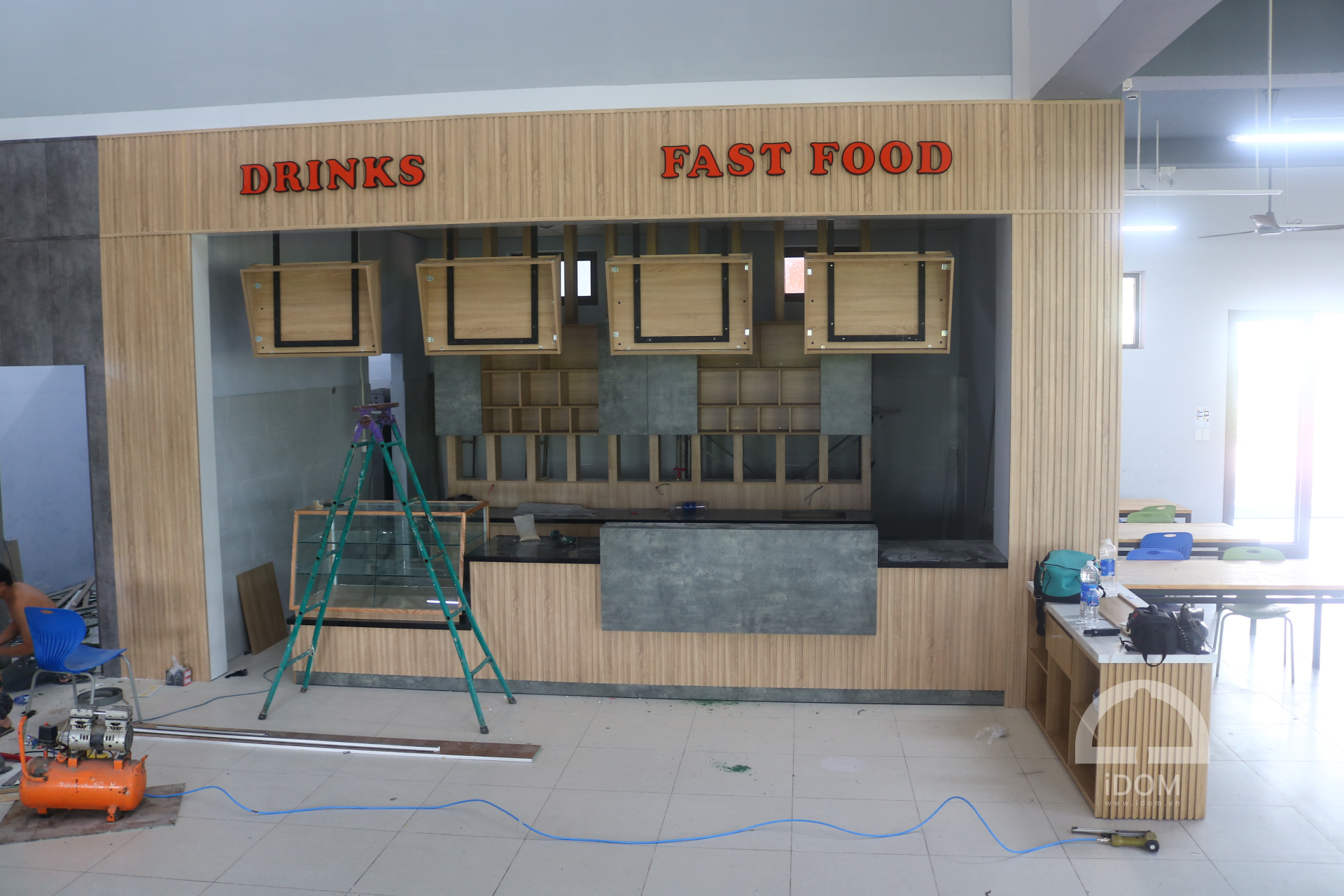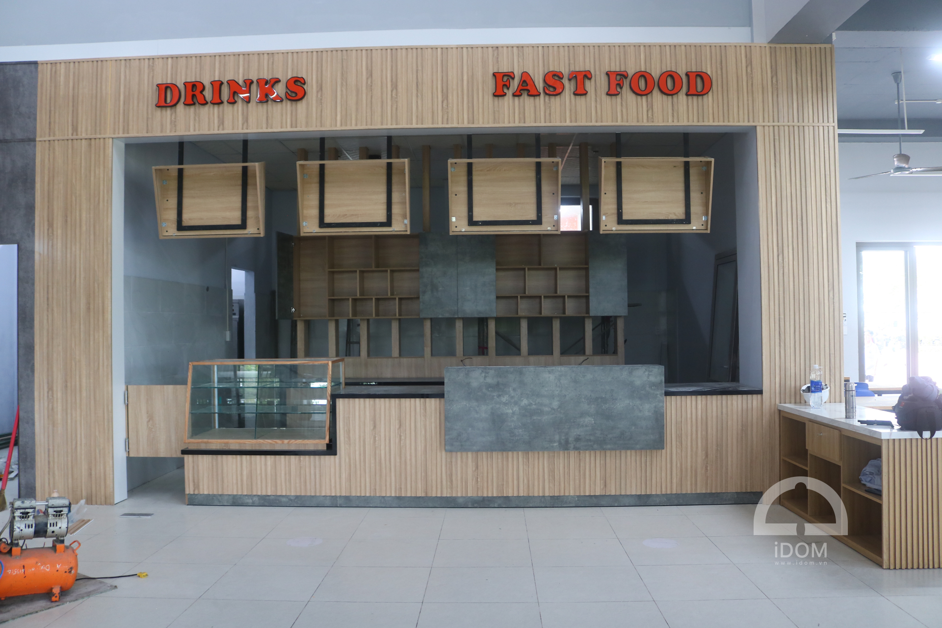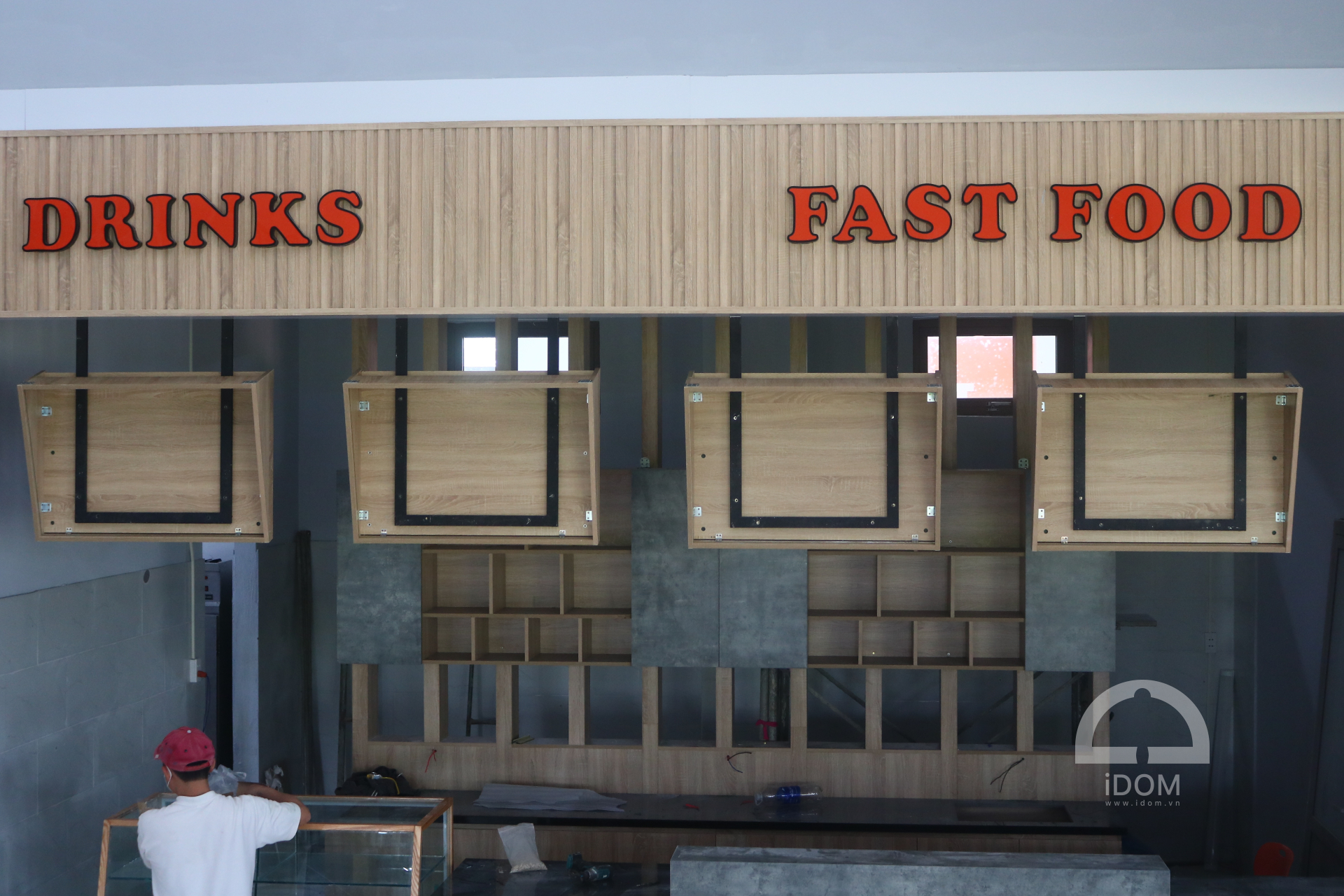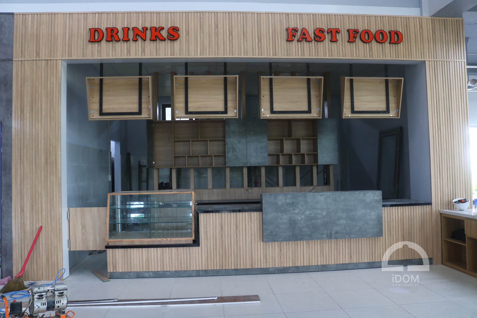 - Quầy nước uống, thức ăn nhanh: ốp vách, bếp nấu, tủ thực phẩm, khung trang trí, vách lam trang trang trí.