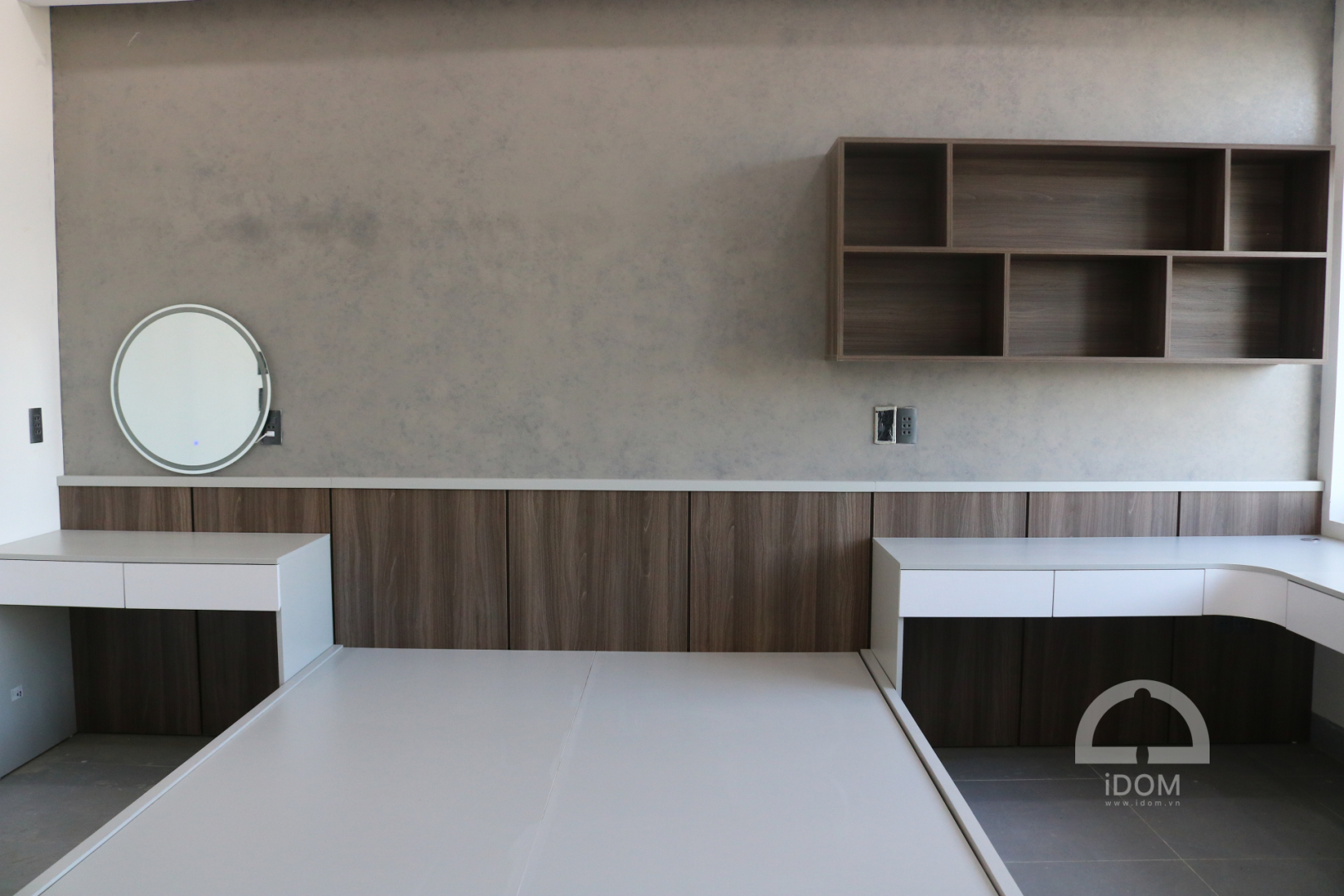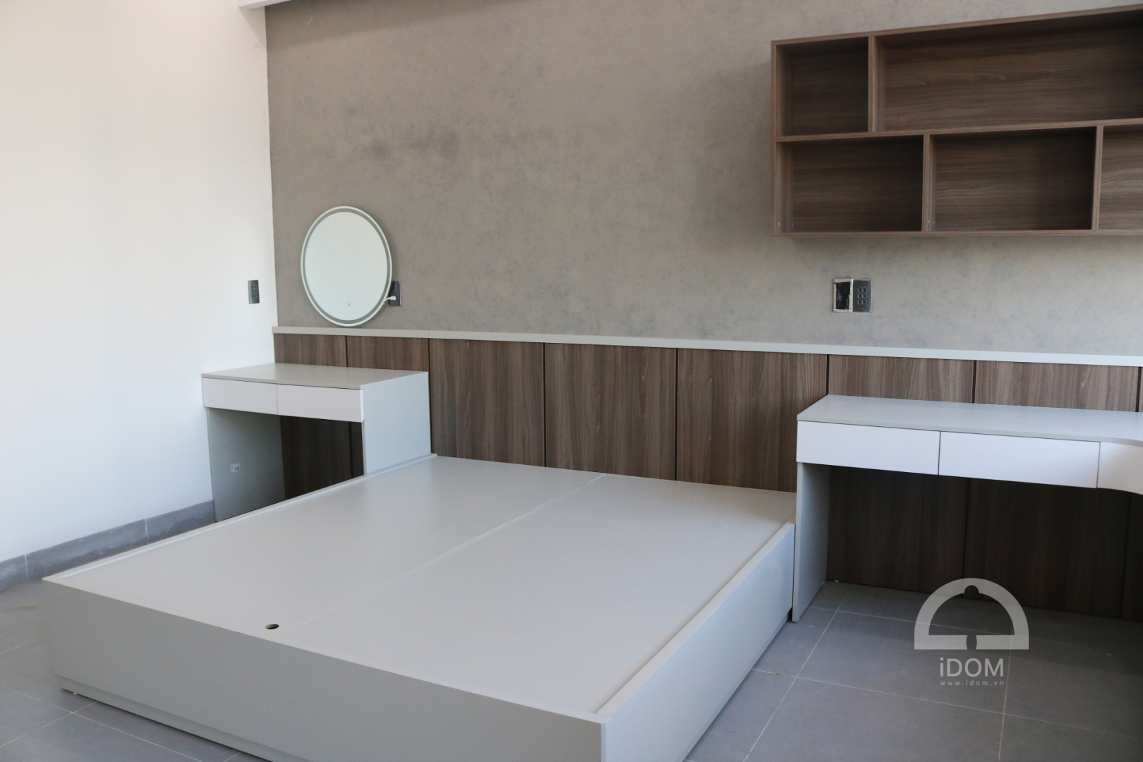 - Phòng ngủ Master: Giường ngủ, Vách ốp đầu giường, Tủ quần áo, Bàn trang điểm, Gương treo bàn trang điểm, Bàn làm việc, Kệ trang trí.