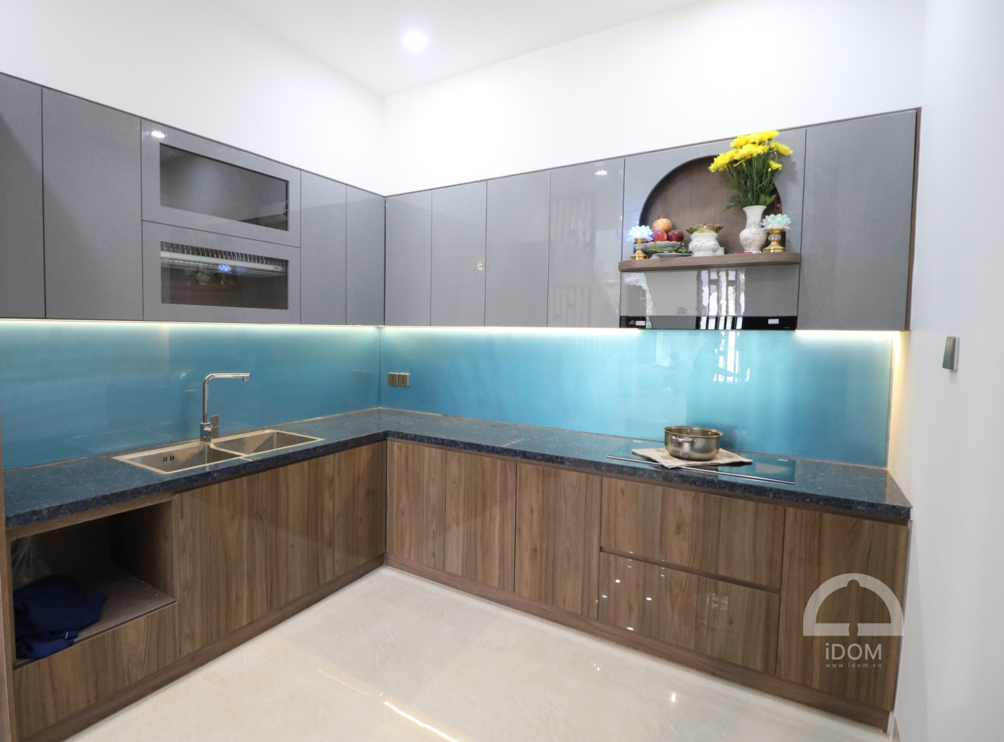 Phụ kiện: Tay nâng Blum, bản lề Hafele, ray trượt Hafele, giá úp bát đĩa, giá xoong nồi, giá gia vị Cucina.