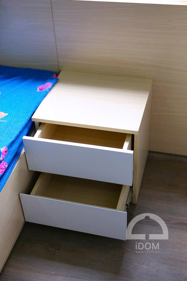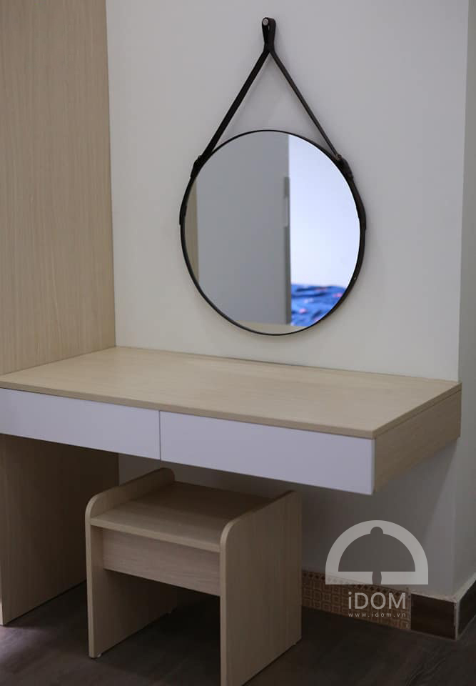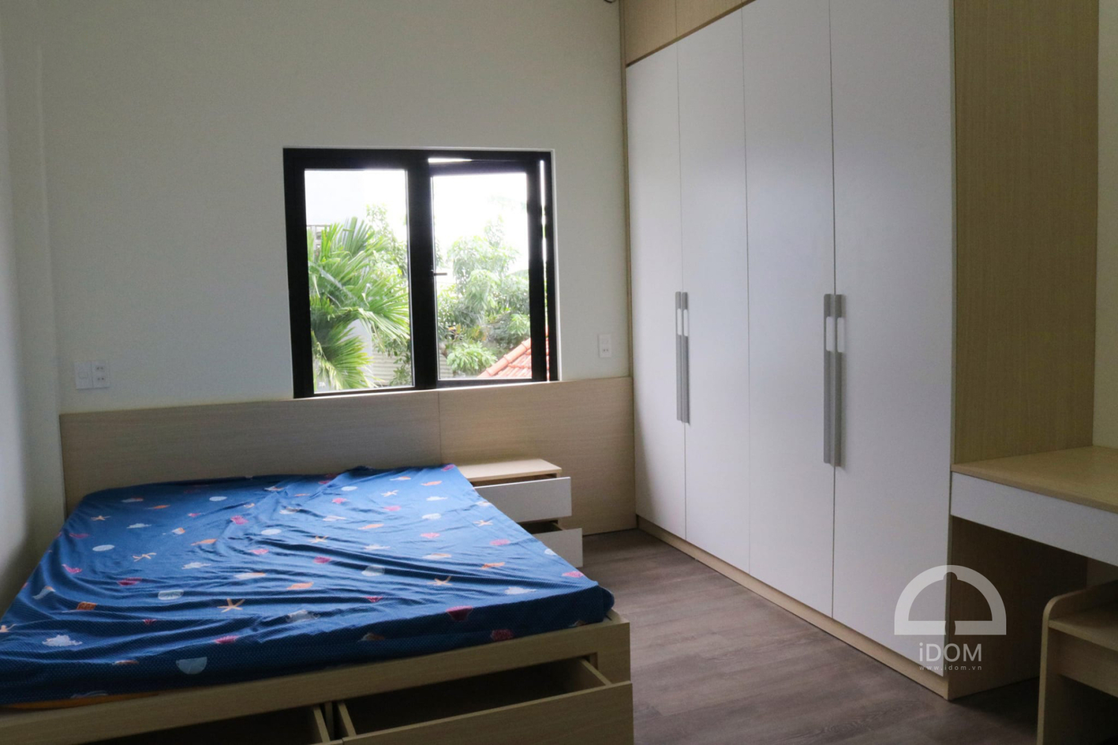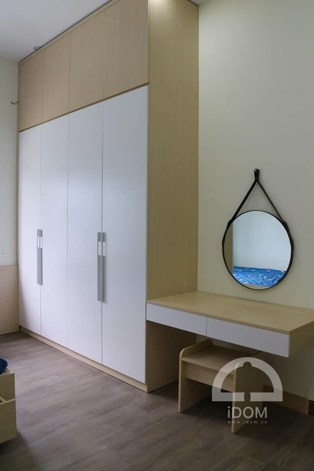 Hạng mục thi công: Giường tầng, vách ốp đầu giường, tab đầu giường, tủ quần áo, bàn trang điểm, gương treo bàn trang điểm.