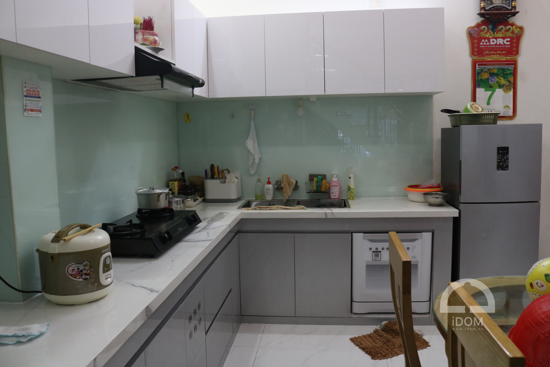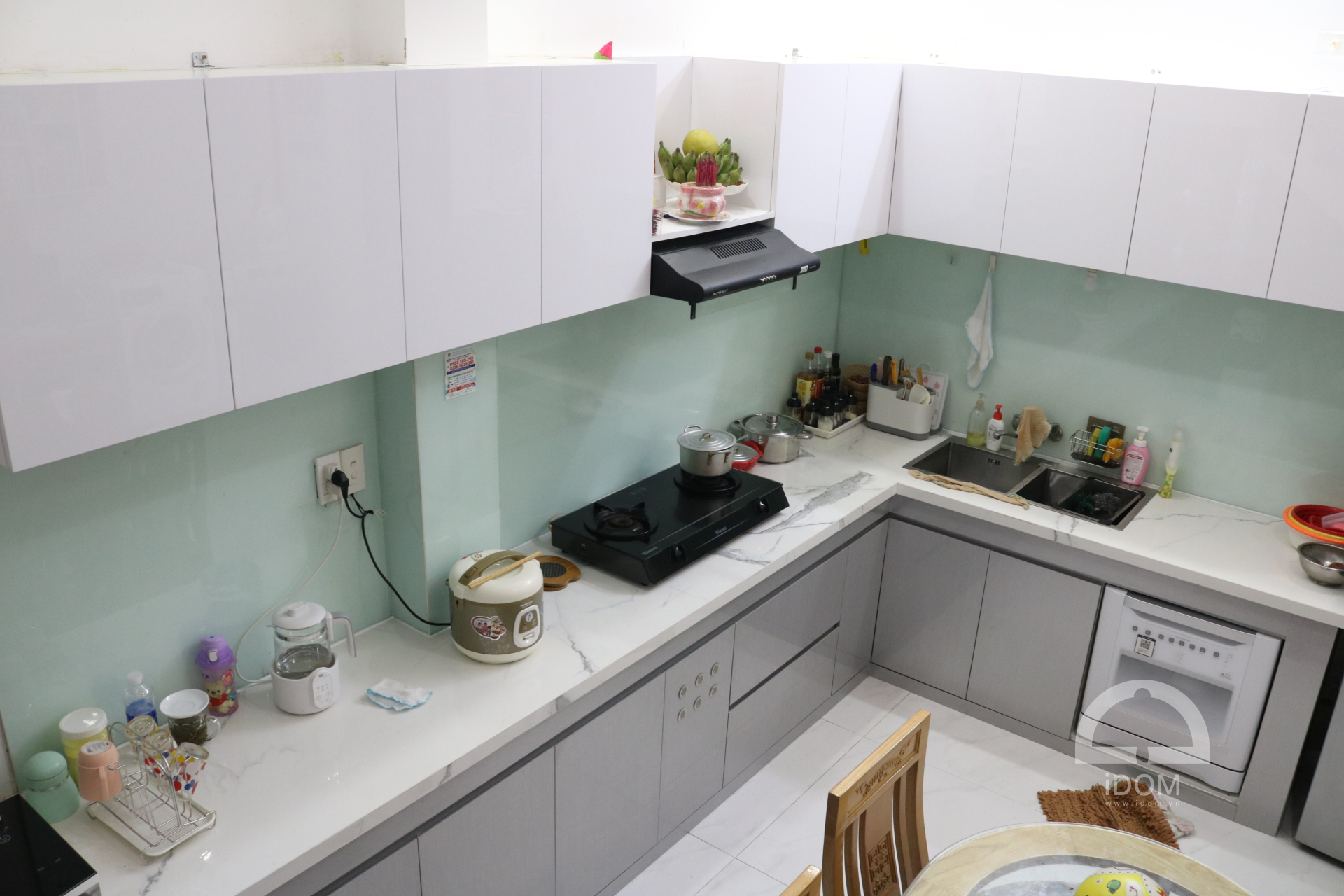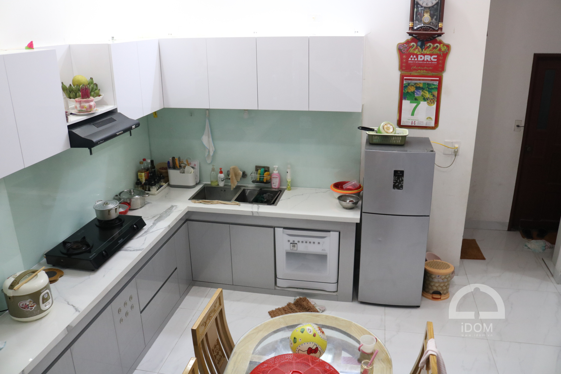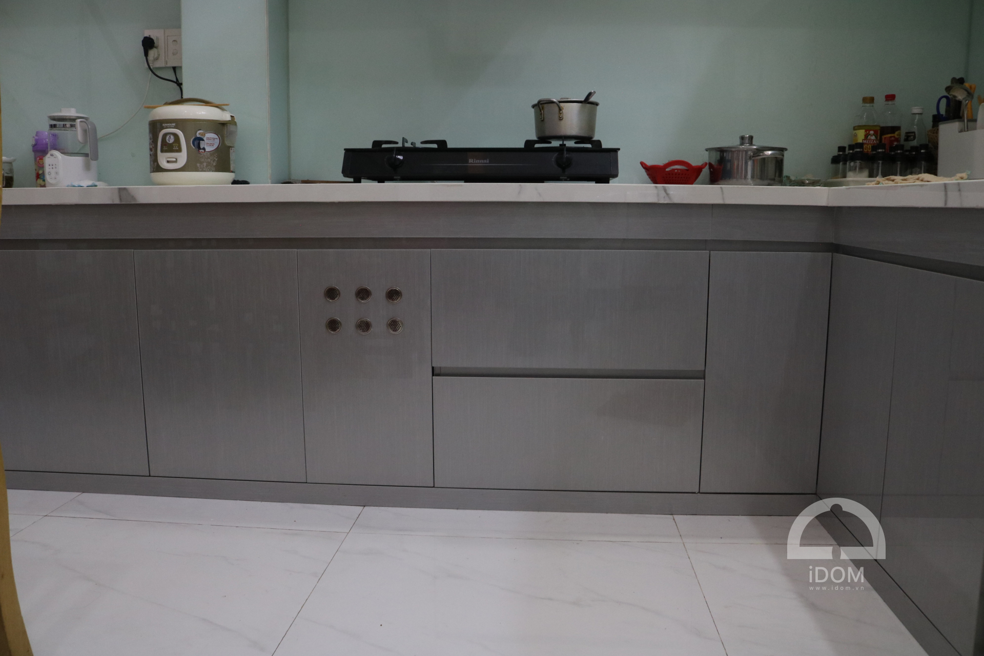 Tủ bếp cũ nhà gia chủ đã xây đanh bê tông tuy nhiên khách hàng không muốn đập bỏ nó, do đó giải pháp của IDOM dành cho tủ bếp lần này là sử dụng chất liệu nhựa PVC phủ Acrylic để làm bếp trên nền khung bê tông có sẵn. Sau đây là một số hình ảnh về mẫu tủ bếp này.