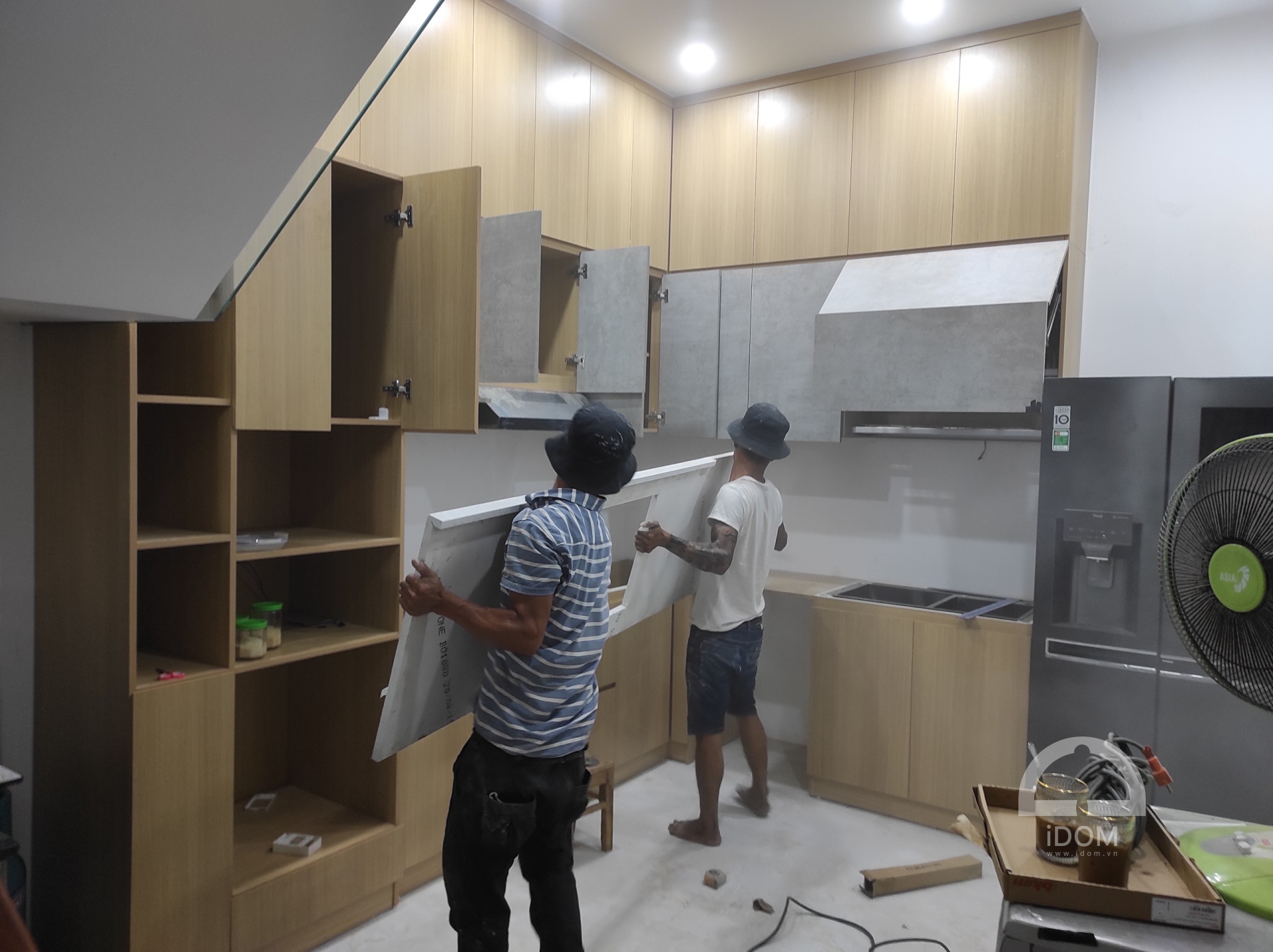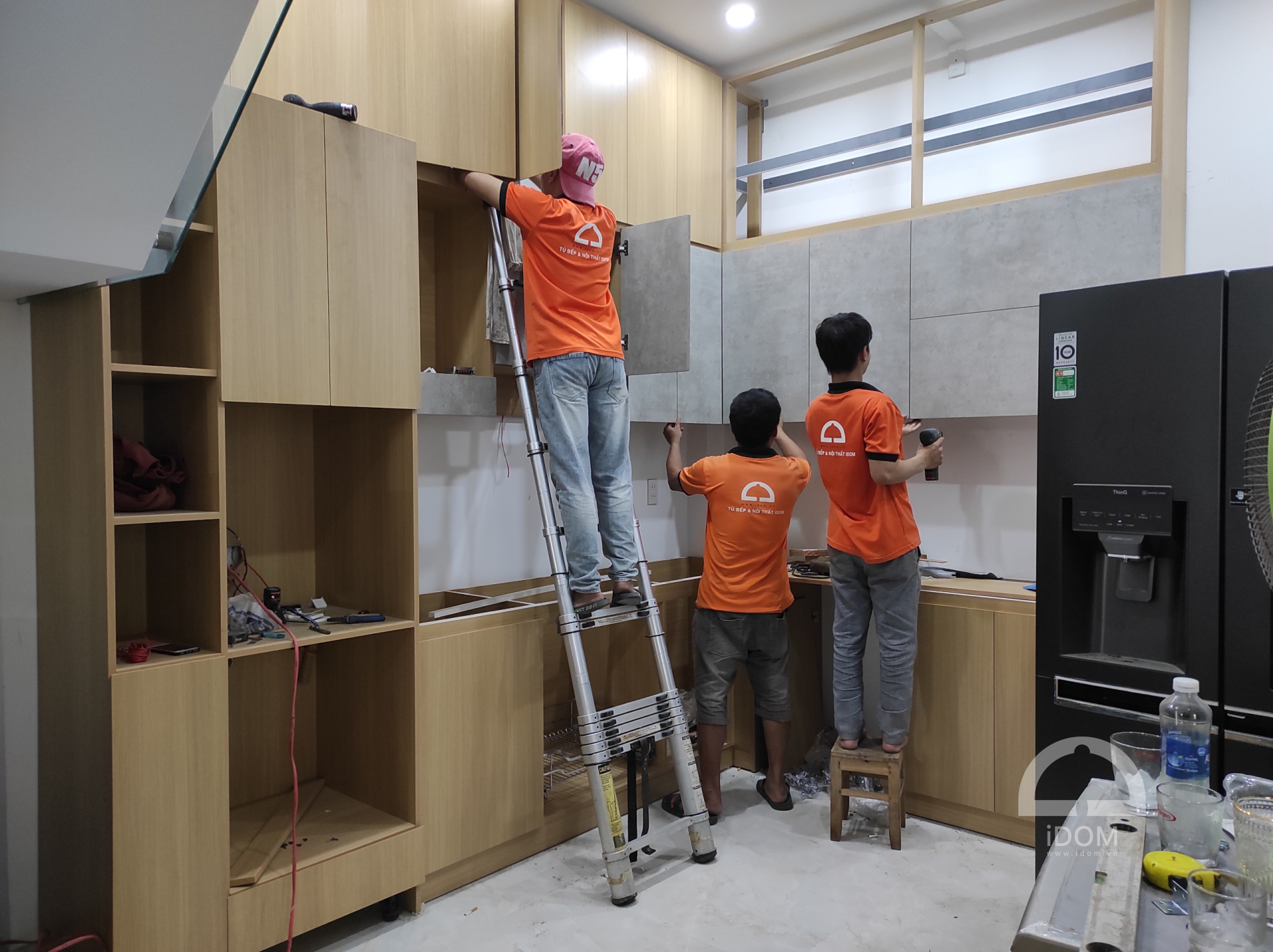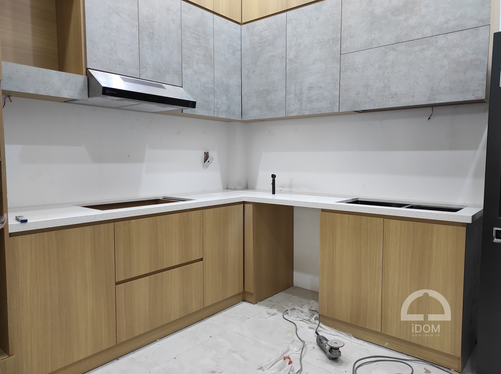 Nội Thất - Tủ Bếp IDOM đã thi công lắp đặt xong tủ bếp gỗ công nghiệp bền đẹp và tinh tế mang đến cho phòng bếp nhà Anh Đức một phong cách hoàn toàn trẻ trung hiện đại. Với tông màu ghi xám (màu bê tông) ở tủ bếp trên và bên dưới là màu vân gỗ mang lại cho gia đình anh một không gian bếp dễ chịu. Sau đây là một số hình ảnh thi công thực tế được thực hiện bởi IDOM.