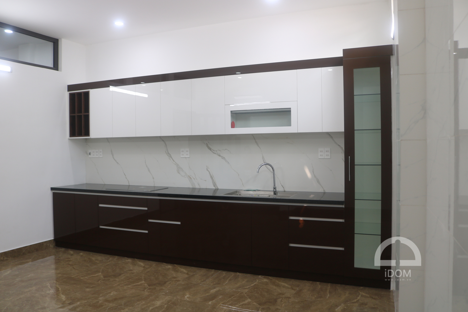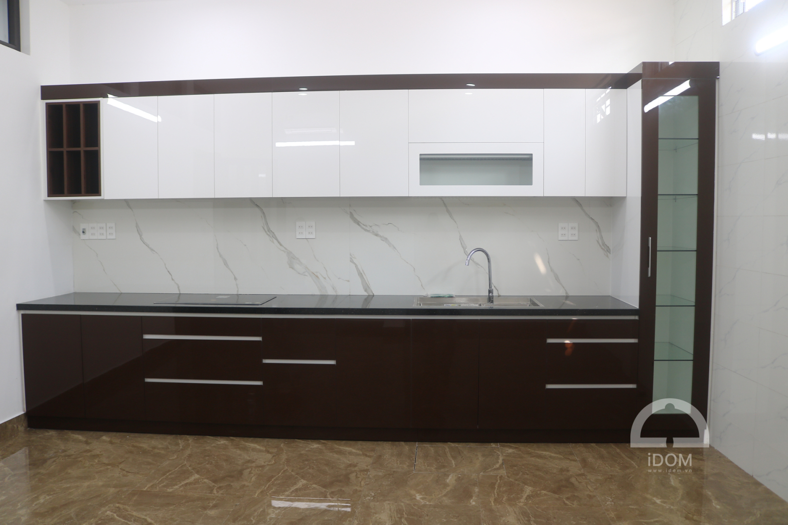 Mẫu tủ bếp Acrylic màu nâu gia đình chị Nhung sử dụng với sự kết hợp màu trắng ở tủ bếp trên, màu nâu "cà phê" ở hệ tủ bếp dưới mang lại không gian bếp hiện đại sự sang trọng, thanh lịch.