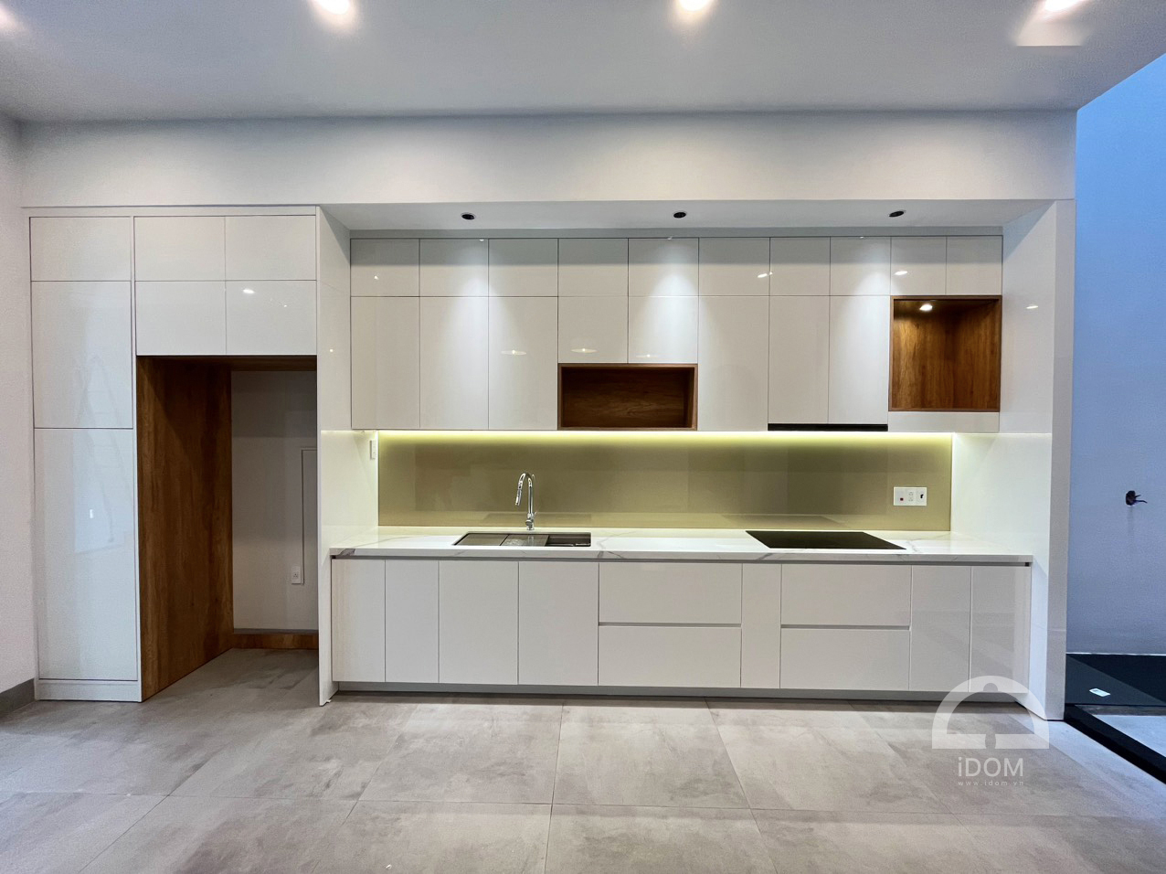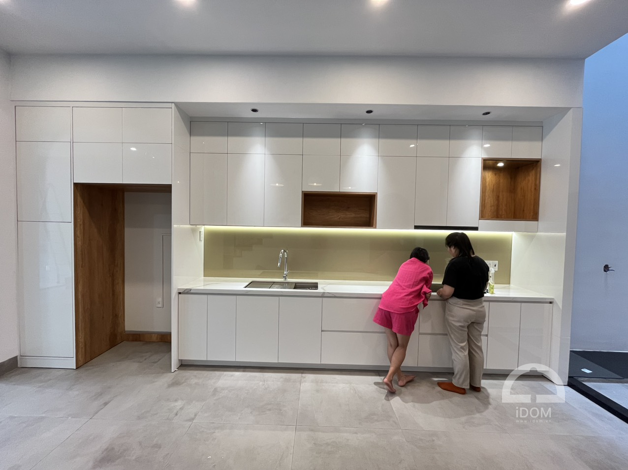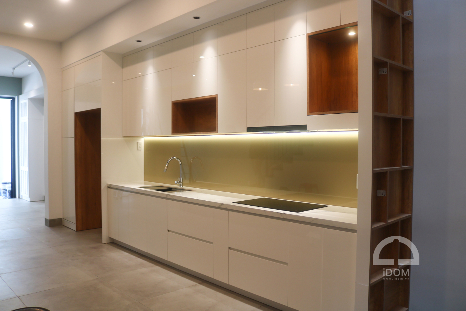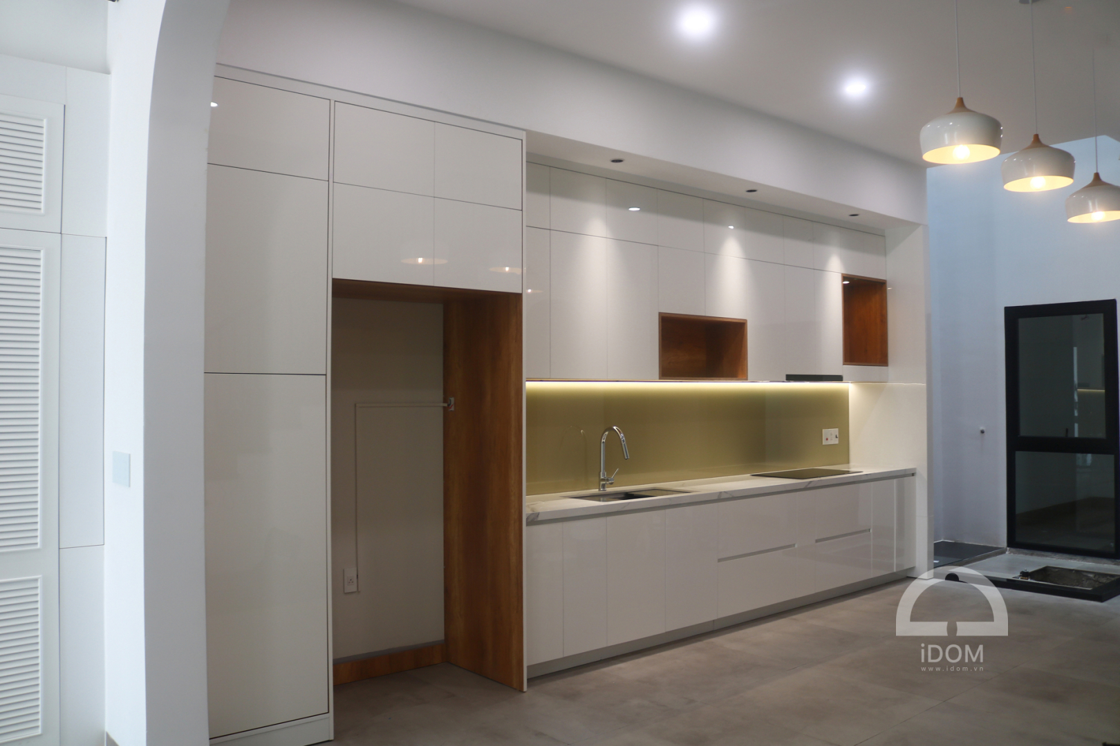 Tủ bếp đẹp hiện đại với tone màu trắng sang trọng làm nổi bật không gian sống. Đây là mẫu tủ bếp nhựa phủ acrylic đã được IDOM thiết kế và thi công hoàn thiện cho khách hàng của mình. Cùng chúng tôi khám phá không gian bếp đầy ấn tượng và cực chill này nhé!